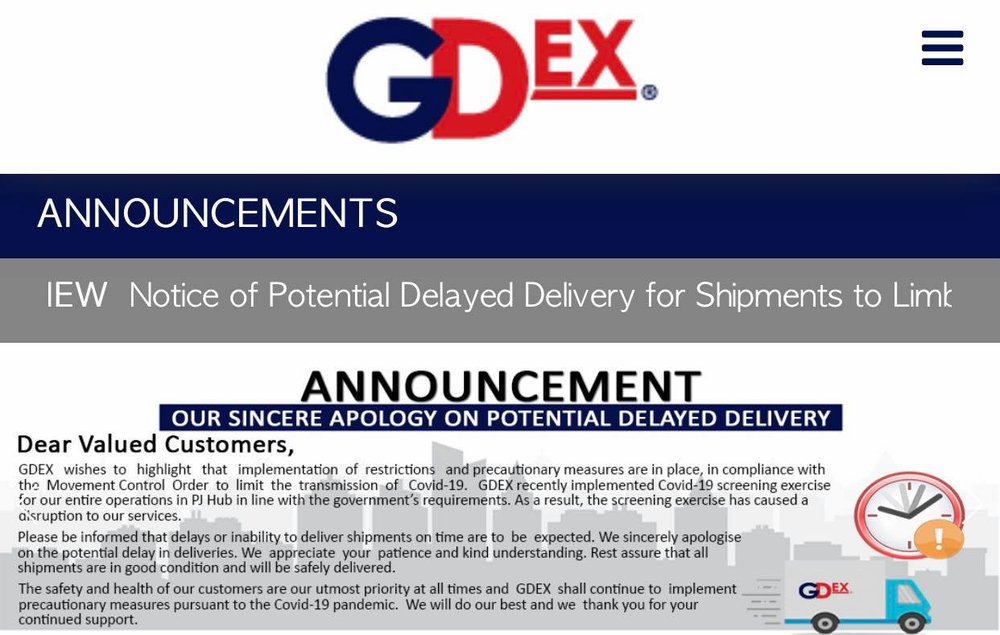 由于马来西亚受疫情影响,行动管制延长至2月4日,期间限制操作人员,目前GDEX仓库爆仓转运困难,包裹时效将会造成延误,请知悉,谢谢大家的谅解。